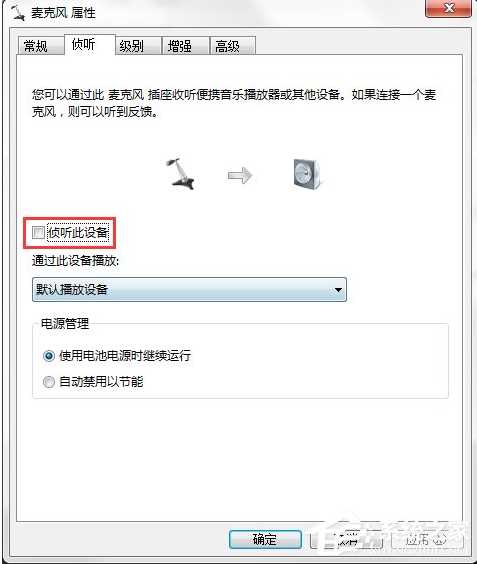 3、在“麥克風(fēng)屬性”在“偵聽”中,找到“偵聽此設(shè)備”,如果之前是打鉤的,那么把鉤去掉;