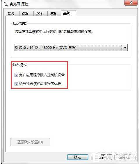6、最后再在“高級(jí)”中,找到“獨(dú)占模式”,在它下邊有兩個(gè)選項(xiàng),全部打鉤。分別是“允許應(yīng)用程序獨(dú)占控制該設(shè)備”“給與獨(dú)占模式應(yīng)用程序優(yōu)先”。你還可以調(diào)下“默認(rèn)格式”,如圖所示: