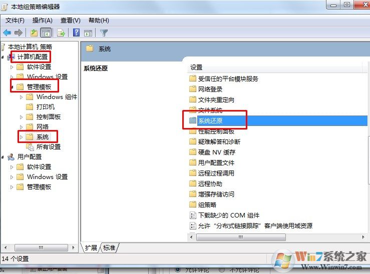 3、計(jì)算機(jī)配置--管理模板--系統(tǒng)--系統(tǒng)還原--禁用關(guān)閉系統(tǒng)還原。