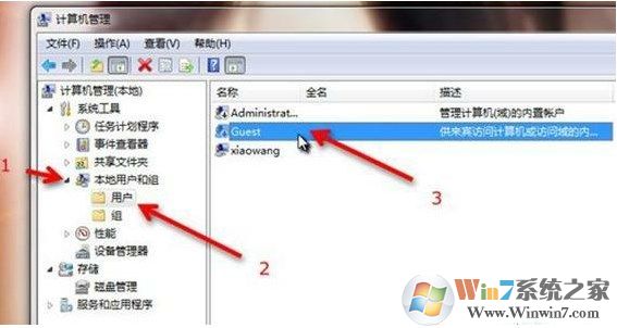 4、在“計(jì)算機(jī)管理”中,我們依次點(diǎn)擊:本地用戶(hù)和組—用戶(hù)—Guest ,雙擊Guest 。