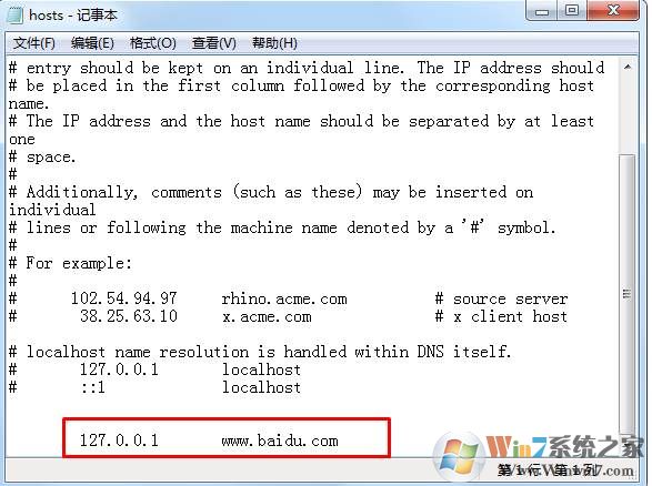 如下圖所示,紅框部分是小編添加的,目地就是把www.baidu.com 這個(gè)域名指向到127.0.0.1這個(gè)IP(這個(gè)IP指向本機(jī))也就是什么都打不開(kāi)了。