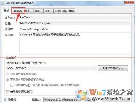 5、接著雙擊【RacTask】,此時(shí)系統(tǒng)會(huì)出現(xiàn)彈出一個(gè)【RacTask屬性】對話框,在對話框中點(diǎn)擊【觸發(fā)器】。