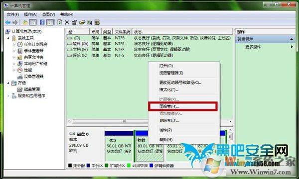 3、通過判斷,我們右鍵點擊空間比較多磁盤分區(qū) ,選中“壓縮卷”。m.cncxm.com Windows7旗艦版