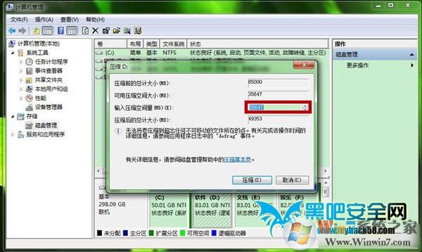 5、系統(tǒng)會彈出“壓縮”窗口,可輸入部分默認的是:可壓縮容量。我們可以輸入想獲得以M為單位的磁盤容量,多少可以自定,注意1G=1024M,然后再點擊“壓縮”。