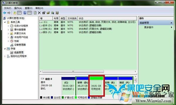 6、完成壓縮后,“磁盤管理”中會多一個“可用空間”,此時還是空閑空間!這部分空間可用于新建磁盤;