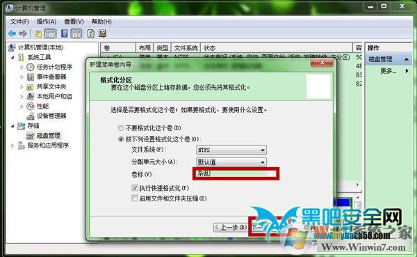 11、我們再“格式化分區(qū)”中,可以為這個新加卷命名,再點擊“下一步”。