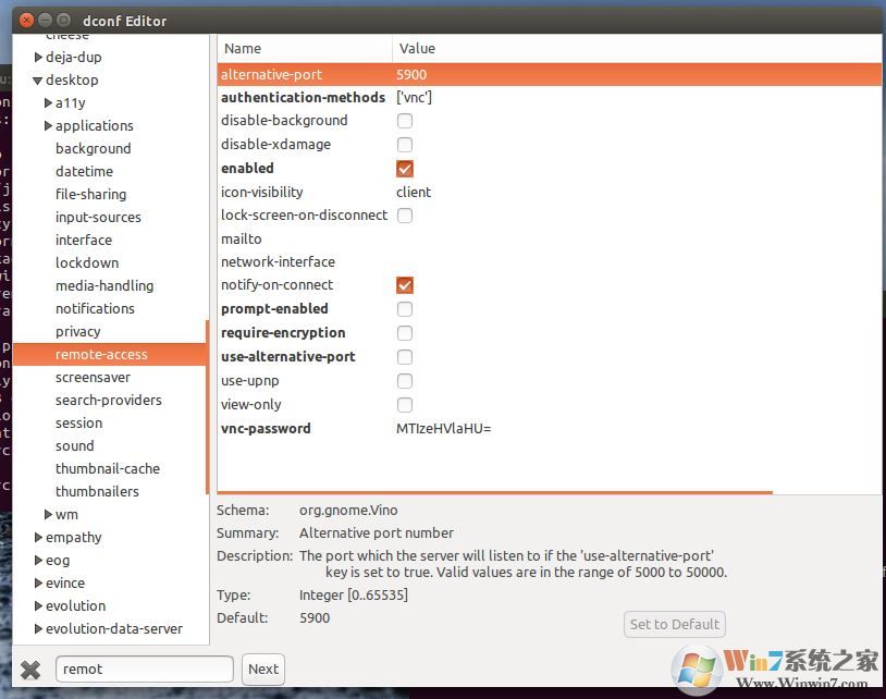 4、設(shè)置dconf Editor。打開軟件,按下“control + F”,輸入“remote”,在窗口中找到“remote -access”選項。如圖所示: