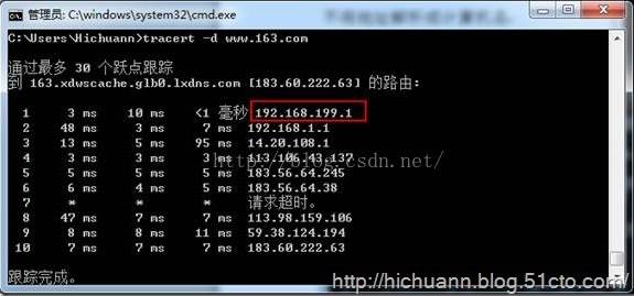 不帶選項(xiàng)的tracert命令將顯示到達(dá)目標(biāo)IP地址所經(jīng)過的路徑,并將IP地址解析為主機(jī)名一同顯示。如下圖所示,第一跳是網(wǎng)關(guān)地址,可以根據(jù)看到的主機(jī)名,判斷我使用的是極路由。