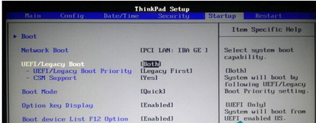 2、接下來切換到“Startup”選項,將光標(biāo)移至“UEFI/Legacy Boot”,同樣地按Enter鍵在彈出的窗口中將UEFI/Legacy Boot選項的值設(shè)置“Both”;隨后將光標(biāo)移至“UEFI/Legacy Boot Priority”,按Enter鍵在彈出的選項窗口中選擇“UEFI First”。如下圖所示: