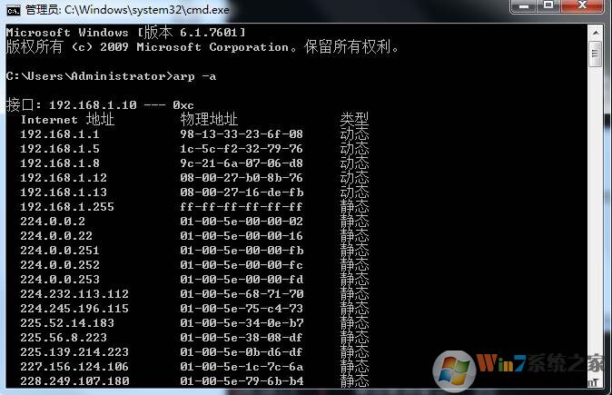 2、然后在命令提示符下輸入 arp -a 回車執(zhí)行; 192開頭的那些都是局域網(wǎng)中的計算機了,不過小編這比較少。