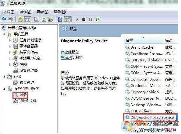 2、調(diào)出計算機(jī)管理窗口后,在其左側(cè)找到服務(wù)和應(yīng)用程序并點(diǎn)擊下拉菜單,打開服務(wù),隨后在右側(cè)找到diagnostic policy service并雙擊打開,如圖所示: