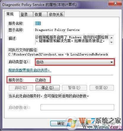 3、打開diagnostic policy service服務(wù)配置之后。將啟動類型改為自動,并啟動該服務(wù),這時服務(wù)狀態(tài)為已啟動,并確定保存設(shè)置,如圖所示: