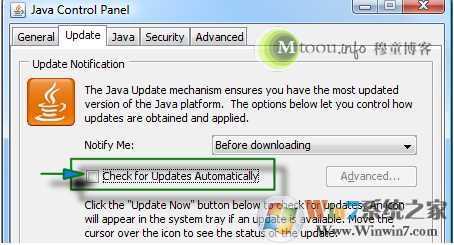 通常情況下此進(jìn)程的運(yùn)行是安全的,當(dāng)然,如果你覺得它沒必要運(yùn)行,那么可以通過在控制面板中查找到Java控制面板選到“更新(Update)”選項卡去掉下面“自動檢查更新”前面的勾選狀態(tài)即可,