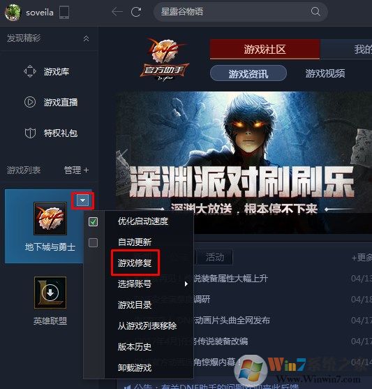 2、然后點(diǎn)擊游戲,右上角的三角小箭頭,然后我們就能看見游戲修復(fù)了