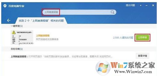 1、建議下載并安裝【百度電腦專家】,打開【百度電腦專家】,在搜索框內(nèi)輸入“上網(wǎng)奔潰報錯”,在搜索結(jié)果里面選擇【立即修復】,修復完成后驗證是否正常: