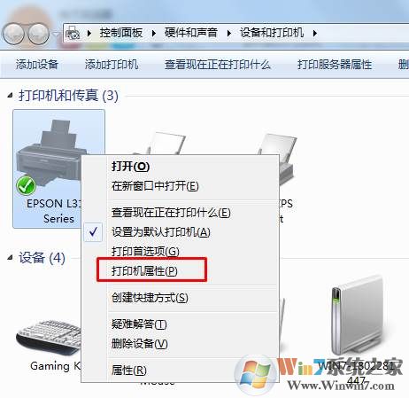 2、在設(shè)備和打印機(jī)中,找到我們要打印的打印機(jī),右鍵——打印機(jī)屬性;