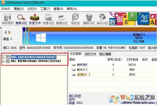 2、在PE系統(tǒng)里面打開(kāi)DG分區(qū)工具,在里面可以看到有兩個(gè)硬盤(pán)(一個(gè)固態(tài),一個(gè)機(jī)械硬盤(pán)),如下圖: