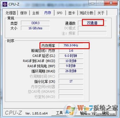 2、打開之后,在內(nèi)存一項(xiàng)中,我們可以看到內(nèi)存頻率為 799.9MHZ ,但是由于是雙通道的,我們還要乘以2,所以得到內(nèi)存頻率為 1600左右。