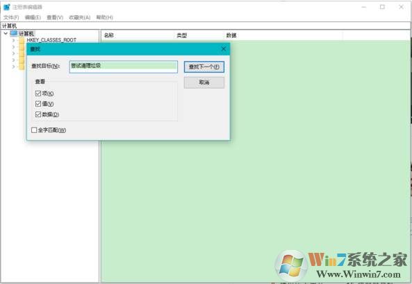 3、在注冊(cè)表上面菜單中點(diǎn)編輯查找,在查找目標(biāo)后面的框中輸入深度清理垃圾 。