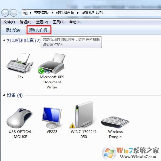 3、在設(shè)備和打印機(jī)設(shè)置窗口中點(diǎn)擊“添加打印機(jī)”操作,