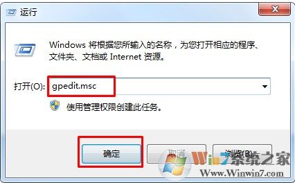 1、首先打開win7系統(tǒng)中的運行對話框,然后輸入gpedit.msc,回車打開組策略;