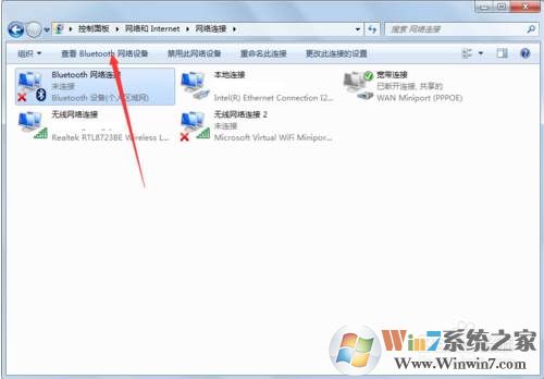 1、我們打到電腦(以下為Win7)先選擇電腦網(wǎng)絡連接頁面的藍牙,然后點擊查看bluetooth網(wǎng)絡設備