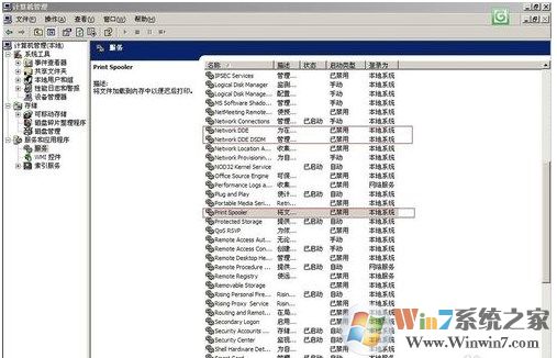 (2)計(jì)算機(jī)的共享打印服務(wù)程序沒有開啟。解決辦法:在桌面右鍵點(diǎn)擊“管理”選擇“服務(wù)與應(yīng)用程序”點(diǎn)擊“服務(wù)”在里邊找到“NetworkDDE”、“Network DDE DSDM”、“PrintSpooler”和“Server”(注:“NetworkDDE”、“Network DDE DSDM”僅限winxp系統(tǒng))這幾項(xiàng)啟動(dòng)基本上就可以了。(見下圖)