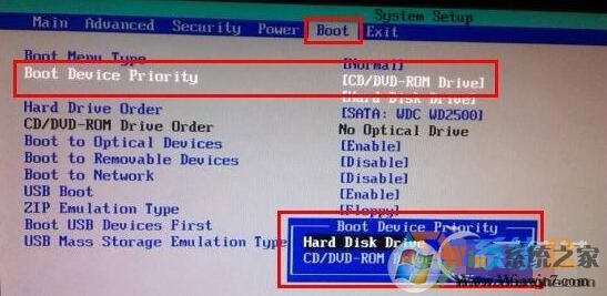 進(jìn)入BIOS設(shè)置界面后,移動(dòng)光標(biāo)切換至“BOOT”菜單下,接著通過(guò)鍵盤(pán)上的上下方向鍵將光標(biāo)移至“Boot Device Priority”,然后回車確認(rèn),在彈出的窗口中選擇“Hard Disk Drive”并通過(guò)鍵盤(pán)上“Page Up”(PS:↑方向鍵)將其移至最上方(第一選項(xiàng))后按F10保存并退出即可,如下圖所示: