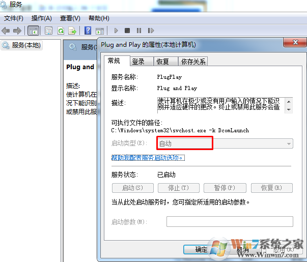 3.在Plug and Play選項的設置窗口中,將切換到常規(guī)這一欄中,然后將窗口中的啟動類型這里修改為自動,最后點擊確定保存設置即可。