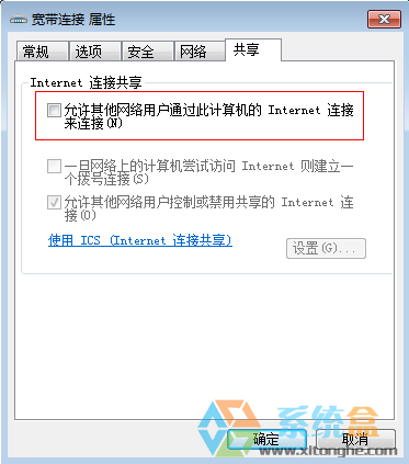 右擊 寬帶連接(以實(shí)際應(yīng)用為準(zhǔn)),選擇 屬性,選擇 高級(jí) 或 共享,在Internet連接共享 下面找到 允許其他網(wǎng)絡(luò)用戶通過此計(jì)算機(jī)的Internet連接來連接,取消勾選并點(diǎn)擊 確定。