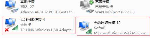 Windows 7/8/8.1等操作系統(tǒng)配置模擬AP時(shí),會(huì)生成兩個(gè)無線網(wǎng)絡(luò)連接,其中一個(gè)為SoftAP連接(本例為無線網(wǎng)絡(luò)連接12),如圖: