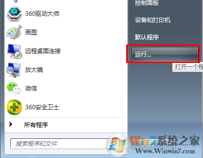 1、打開開始菜單,選擇運(yùn)行打開運(yùn)行窗口