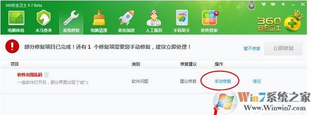 3、安裝好Microsoft AppLocale后重啟電腦,打開軟件還是有亂碼,這時(shí)就嘗試另外的方法。在電腦上安裝安全衛(wèi)士軟件,測(cè)試時(shí)使用的是360安全衛(wèi)士,利用系統(tǒng)修復(fù)掃描系統(tǒng),會(huì)顯示一條軟件出現(xiàn)亂碼的錯(cuò)誤,點(diǎn)擊修復(fù)按鈕開始修復(fù);