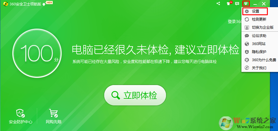 1、打開360安全衛(wèi)士,點(diǎn)擊右上角的倒立小三角,軟后選擇設(shè)置
