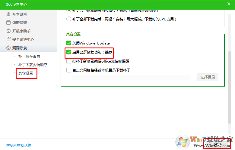 2、找到漏洞修復(fù),然后點(diǎn)擊最下方的其它設(shè)置,將啟用藍(lán)屏修復(fù)功能勾選即可
