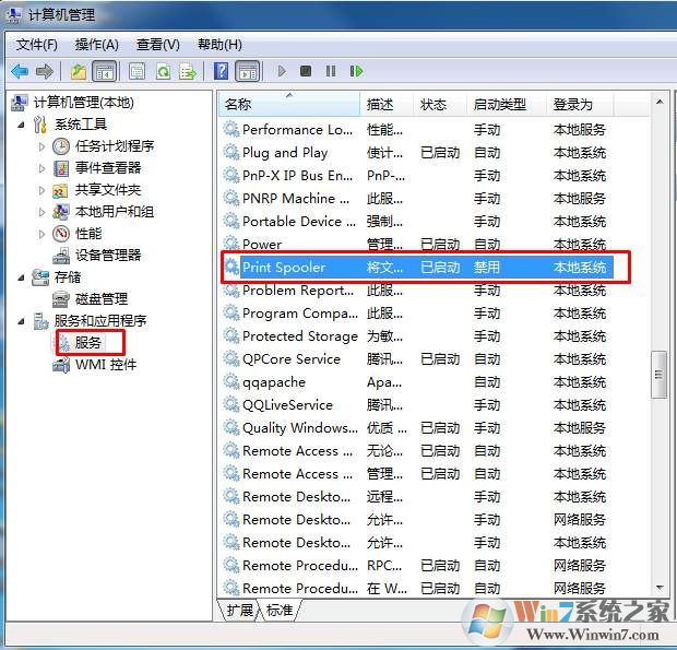 2、在“管理”窗口中,選取“服務和應用程序”擴展項目下的“服務”選項,在右側(cè)出現(xiàn)系統(tǒng)服務列表中找到“Print Spooler”服務,雙擊進入“Print Spooler”服務設置;