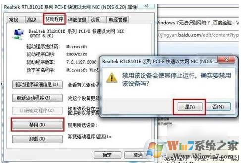 4、然后點(diǎn)“驅(qū)動程序”,點(diǎn)“禁用”,彈出禁用該設(shè)備會使其停止運(yùn)行的對話框,點(diǎn)“是”