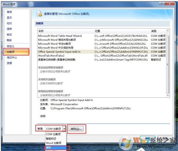 4、打開的對話框中,在左側(cè)的菜單欄中點擊“加載項”。在加載項下,最下面的管理下拉框中選擇“模板”,然后點擊“轉(zhuǎn)到”。