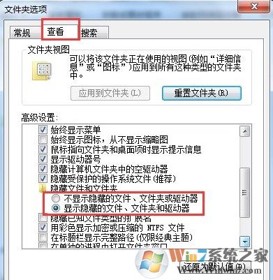 8、打開文件夾選項中的“查看”選項卡,里面找到“隱藏文件和文件夾”,選擇“顯示隱藏的文件、文件名和驅(qū)動器”,點擊確認應(yīng)用即可。