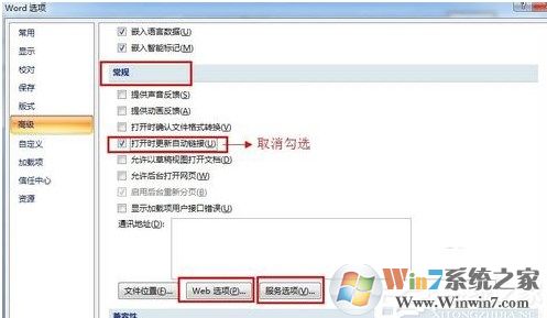 3、打開的對話框中,在左側(cè)的菜單欄中點擊“高級”。在高級選項卡里,找到“常規(guī)”,將里面“打開自動鏈接”的勾取消。