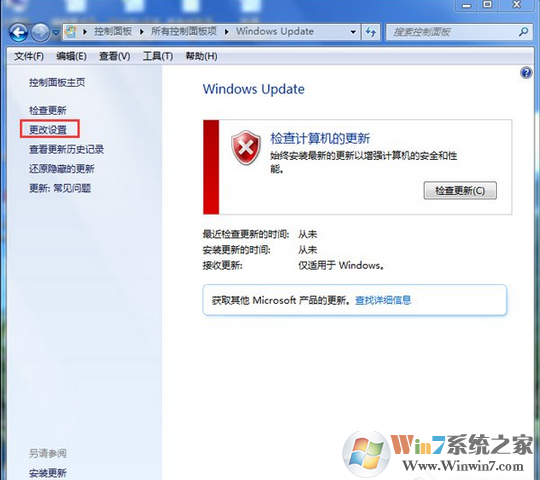 在Windows Update中找到“更改設(shè)置”并雙擊進(jìn)入設(shè)置界面