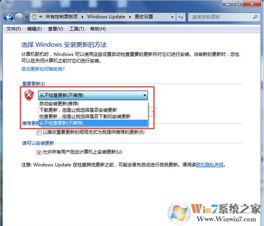 在“重要更新”中選擇“從不檢查更新(不推薦)”,并點(diǎn)擊“確定”。這樣系統(tǒng)就不會更新。
