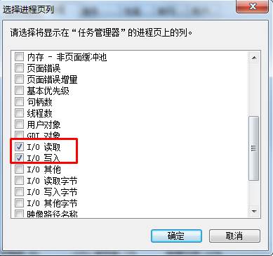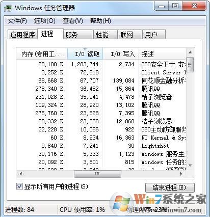 4、確定后回到任務(wù)管理器,我們就可以看到當(dāng)前進(jìn)程對(duì)硬盤的讀取和寫入狀況了,可惜的是沒(méi)有百分比顯示