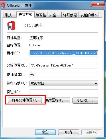 1、右鍵點(diǎn)擊office助手圖標(biāo)選擇屬性,然后點(diǎn)擊,打開文件位置;