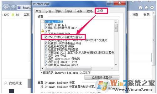 2、這時(shí)我們再選擇高級(jí),在設(shè)置列表中,將“對證書地址不匹配發(fā)出警告*”前面的勾去掉,確定即可;