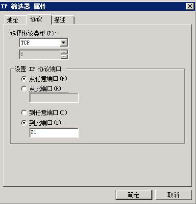 8、接下來(lái)點(diǎn)擊“協(xié)議”選項(xiàng)卡,在“選擇協(xié)議類(lèi)型”中選擇“TCP”,到此端口填“21”,接著點(diǎn)擊“描述”選項(xiàng)卡,填寫(xiě)描述“禁用21”,點(diǎn)擊“確定”。 Win7系統(tǒng)之家 m.cncxm.com