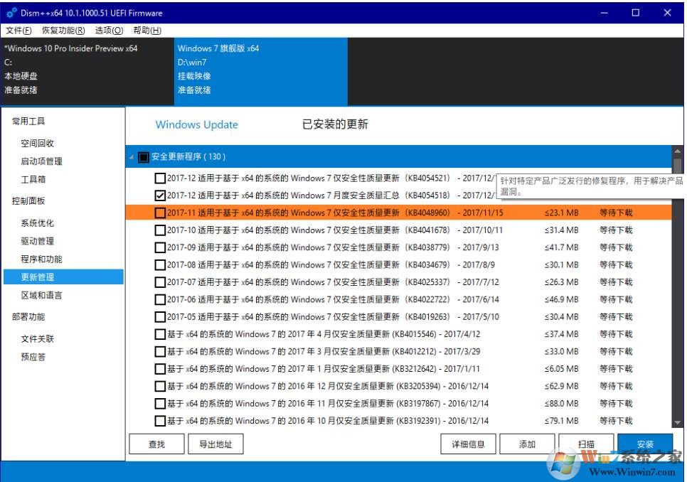 首先先來(lái)更新一下系統(tǒng)補(bǔ)丁,Dism++有一個(gè)補(bǔ)丁數(shù)據(jù)庫(kù),我們只要在該工具中點(diǎn)擊查找更新就可以列出當(dāng)前系統(tǒng)可用的所有補(bǔ)丁。可以看到有些補(bǔ)丁是黃色的,這是由于這些補(bǔ)丁可能會(huì)額外引入問(wèn)題,所以Dism++不推薦安裝。