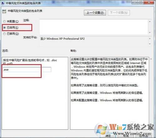 4、把這個項目配置成“已啟用”,下面輸入“.exe”,點擊確定,如下圖所示: