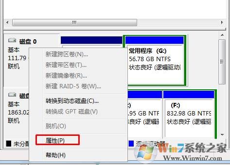 3、右鍵點(diǎn)擊你的系統(tǒng)硬盤,一般是磁盤0,選擇屬性;