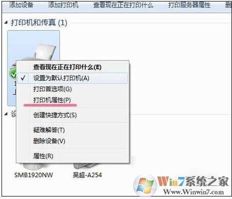 4、還是不行的話,回到打印機(jī)頁面,右鍵有問題的打印機(jī),選擇”打印機(jī)屬性“打開屬性設(shè)置;